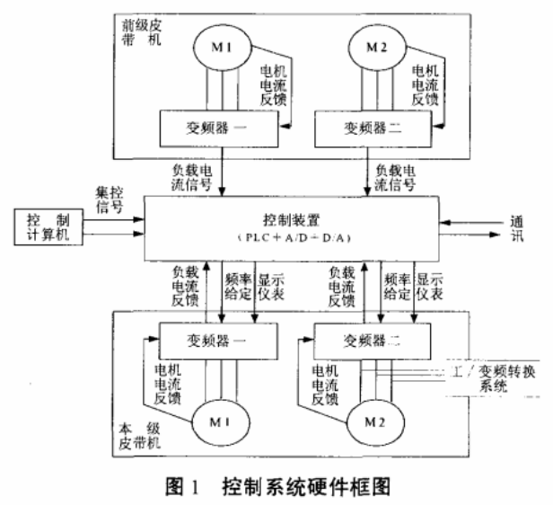 皮帶輸送機(jī)控制系統(tǒng)由變頻器、執(zhí)行電機(jī)、控制裝置和負(fù)載電流檢測等組成。控制裝置由可編程邏輯控制器PLC、A/D及D/A轉(zhuǎn)換模塊等組成,其中變頻器由隔爆殼主腔、隔爆接線腔、本安控制腔、變頻調(diào)速控制系統(tǒng)、程序參數(shù)控制器組成,控制裝置由可編程邏輯控制器PLC、AD及D/A轉(zhuǎn)換模塊等組成。負(fù)載電流信號(hào)來源于各驅(qū)動(dòng)皮帶機(jī)變頻器的電流反饋信號(hào)21,硬件框圖參見圖1。